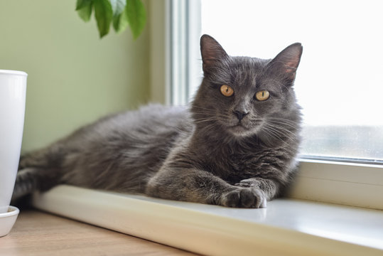 Gray Cat Nebelung Cat Is Lying On The Windowsill Stock Photo 66484505 Pixta